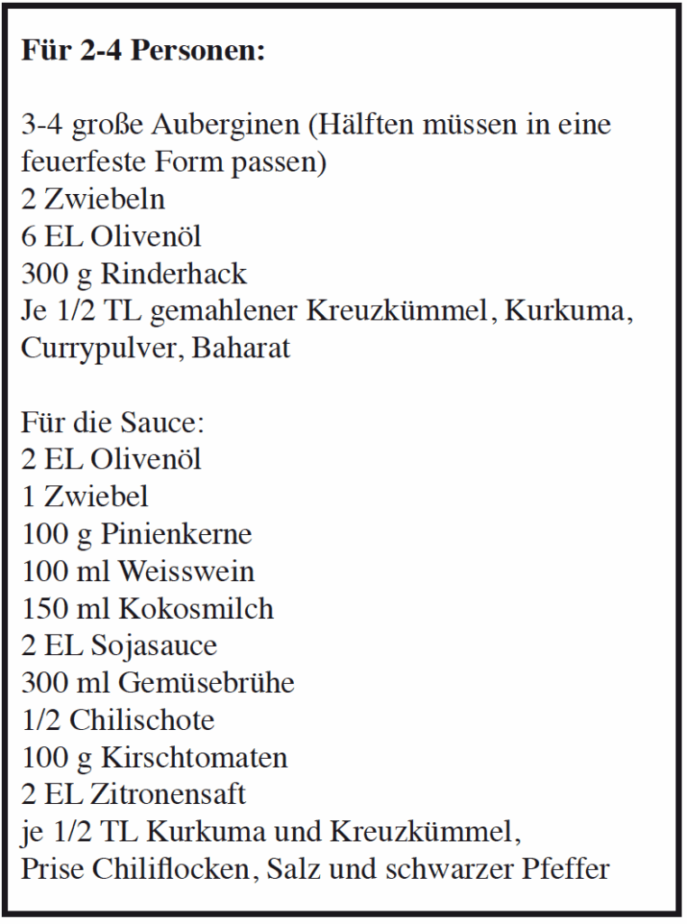 Schließlich die Auberginenhälften in der feuerfesten Form anordnen, das Hackfleisch darauf verteilen, die Sauce darüber geben und bei 150 Grad Umluft ca. 30 Minuten im Backofen schmoren.