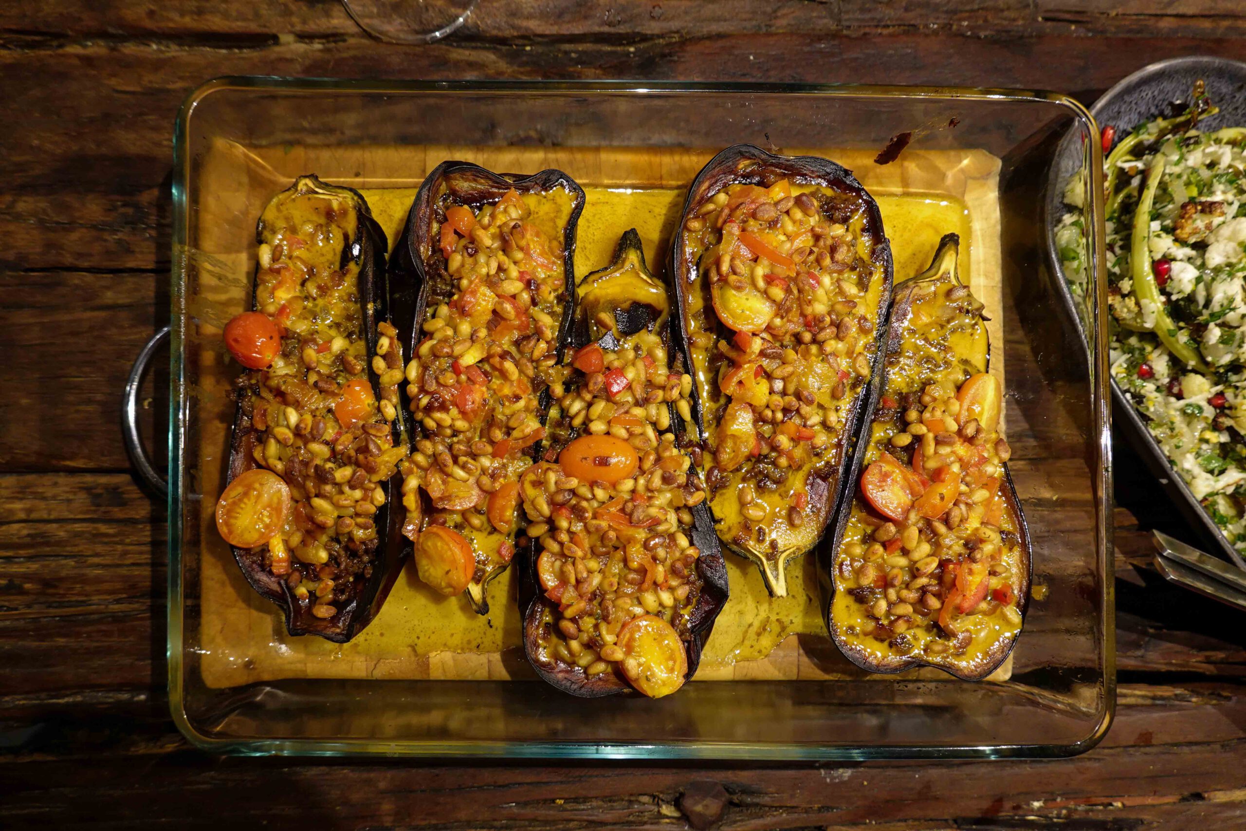 Am besten die Form mit den Auberginen auf den Tisch stellen.