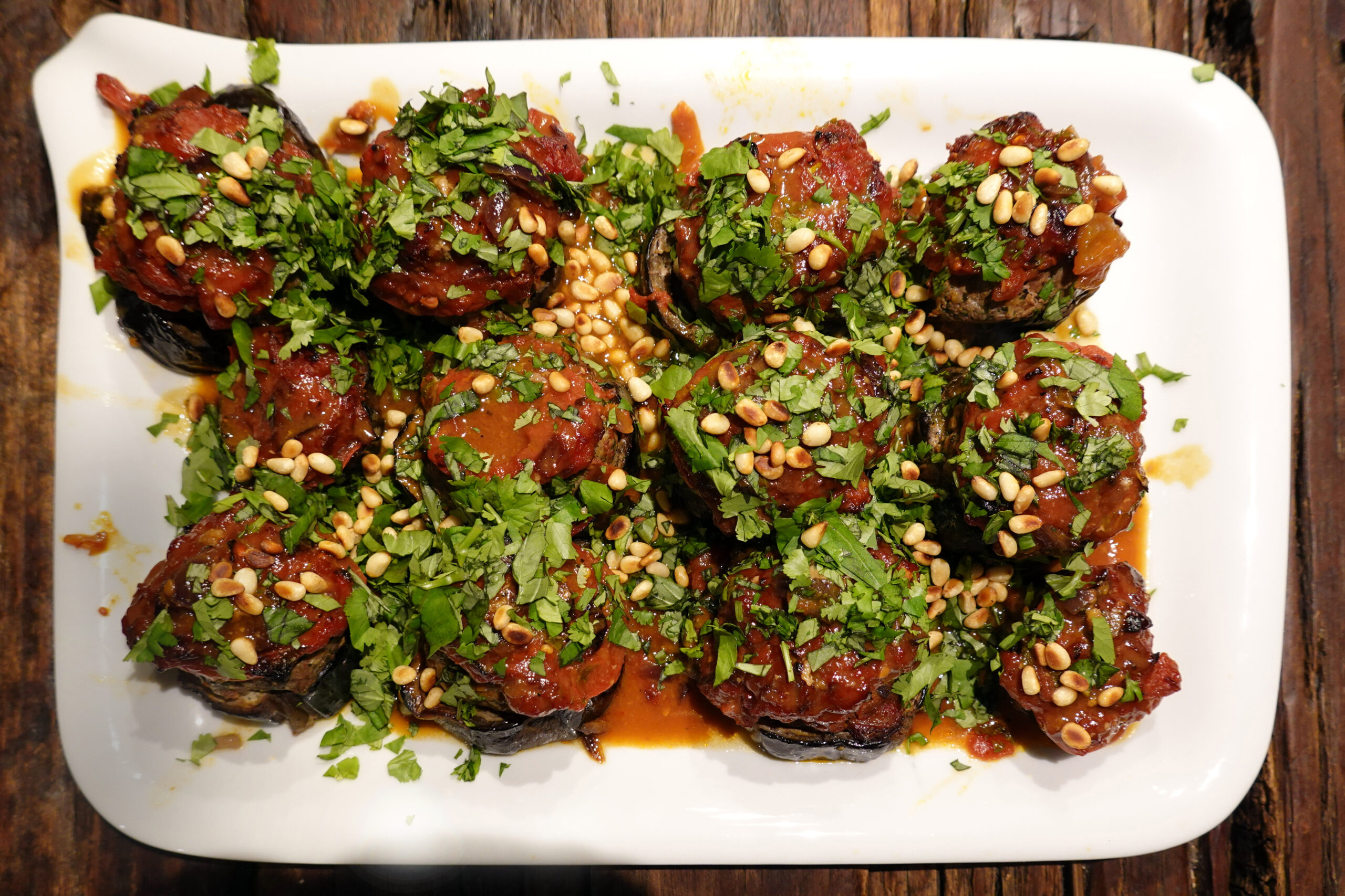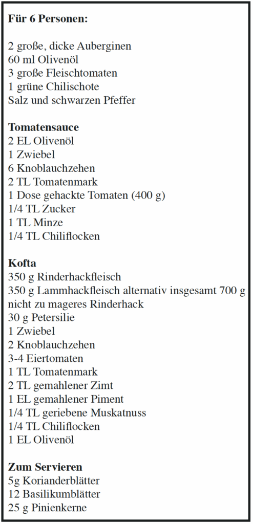 Die Kofta aus dem Ofen nehmen, die Auberginenscheiben aus der Form auf eine Platte heben. Die Flüssigkeit aus der Form in einen Topf gießen und auf die Hälfte einkochen.