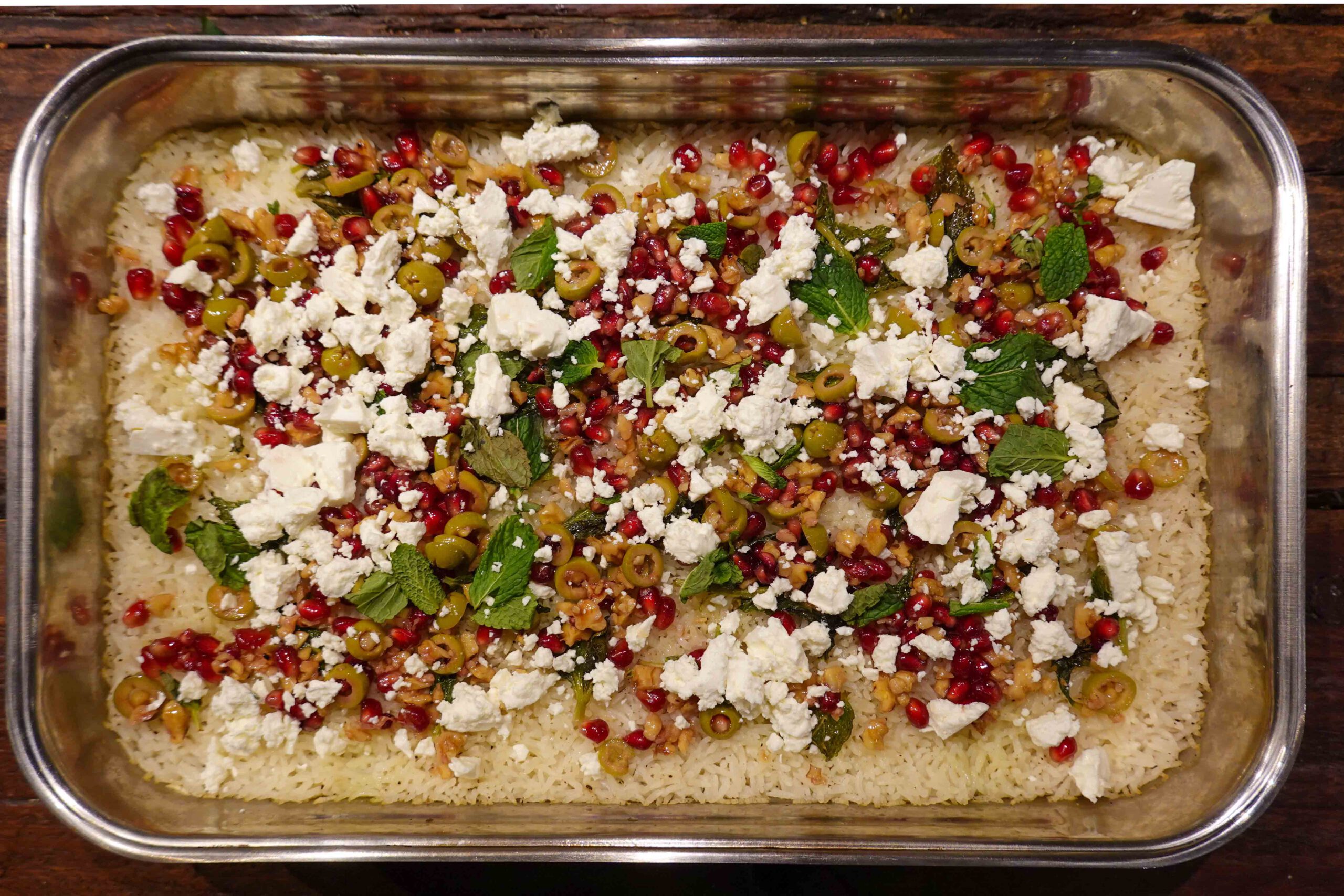Den Feta zerbröseln und die Minzeblätter mit dem Feta auf dem Reis verteilen.