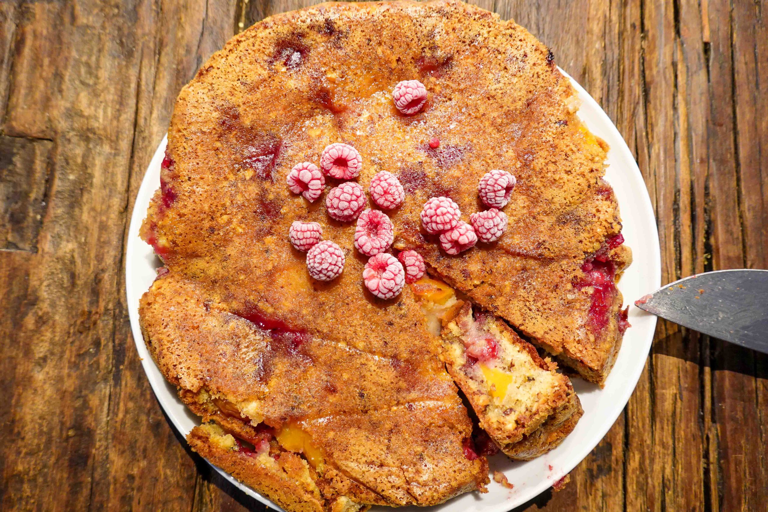 Das ursprüngliche Rezept zu diesem Kuchen stammt von unserem Lieblingskoch Ottolenghi. Er backt den Kuchen mit Pfirsichen. Als wir den Kuchen das erste Mal gemacht haben, gab’s keine Pfirsiche, also haben wir Nektarinen genommen. Beim zweiten Mal gab’s auch keine Nektarinen. Da kamen wir auf die Idee, es mit einer reifen Mango zu probieren die noch so bei uns rumlag. Das Ergebnis war perfekt.