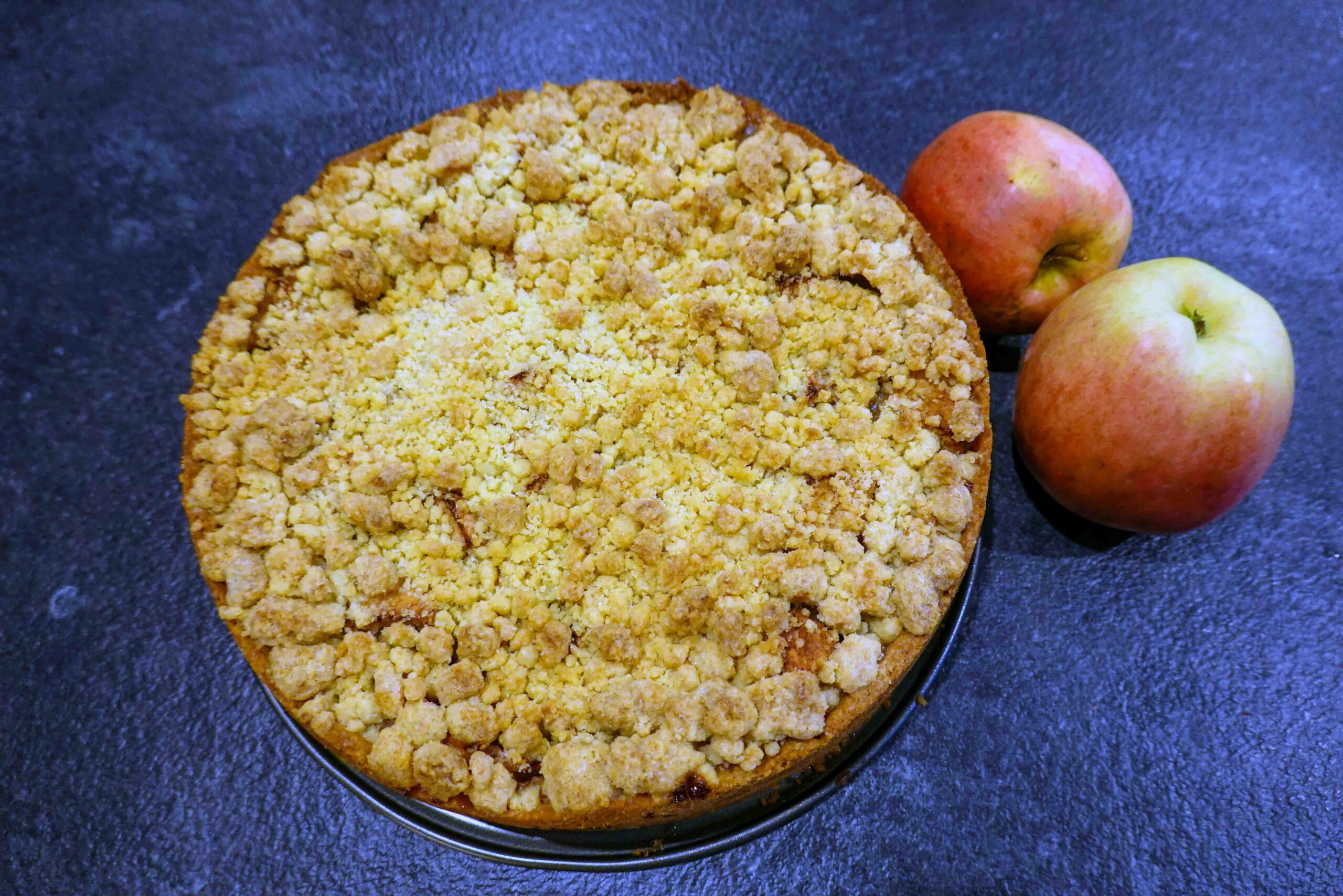 Den Teig für den Boden aus dem Kühlschrank nehmen und auf einer bemehlten Unterfläche dünn ausrollen. Das klappt meistens nur bedingt reibungslos. Dann einfach die Teigteile in der Form zusammenfügen und andrücken. Aus dem dünnen Teig einen 3 cm hohen Rand formen. Dann die Äpfel einfüllen und gleichmäßig verteilen. Wenn noch Teig übrig ist, ruhig in kleinen Teilen zwischen die Äpfel drücken. Schließlich die Streusel oben drauf locker verteilen.