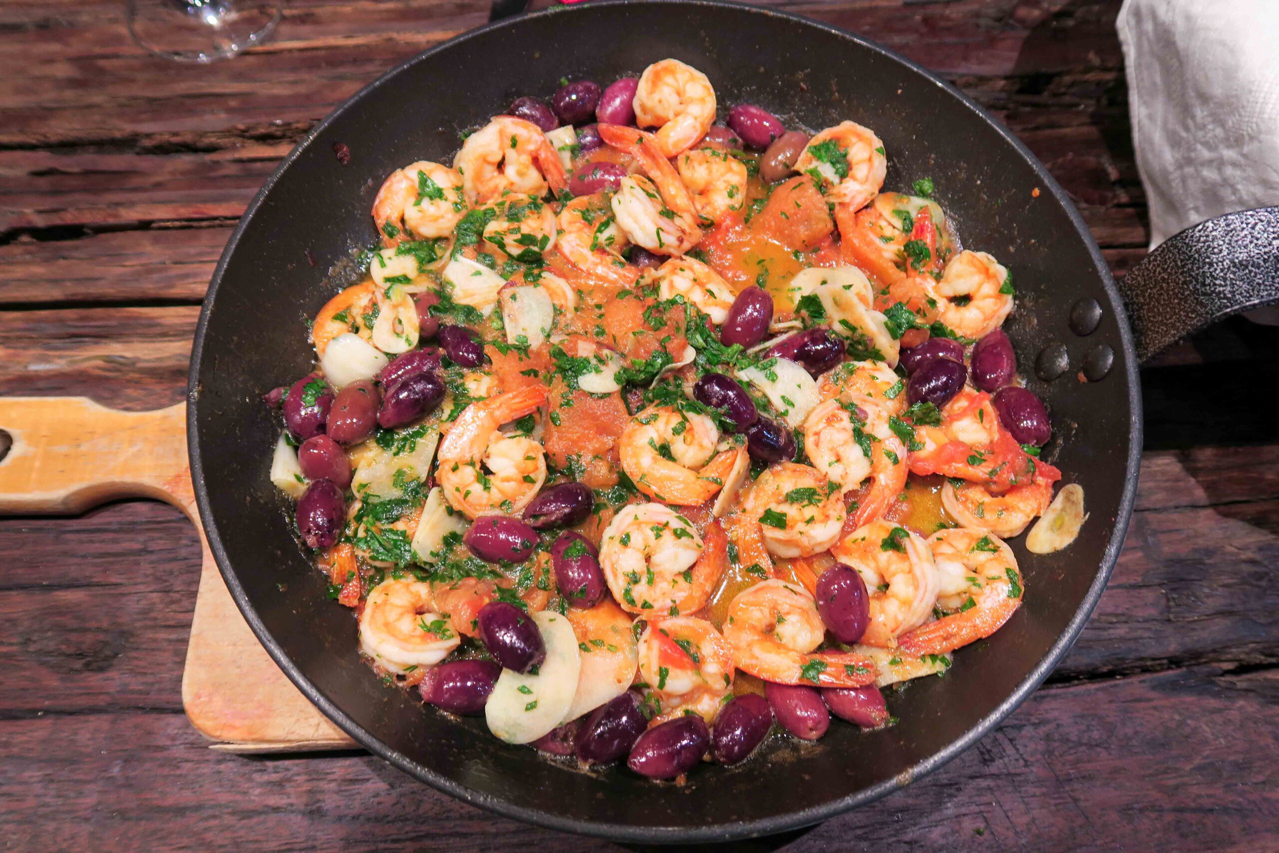 Eine Pfanne auf dem Herd stellen, erhitzen und 20 g Butter hinein geben. Wenn die Butter heiß ist, die Garnelen 2 Minuten unter ständigem Rühren in der Pfanne anbraten. Dann die Tomaten, Chiliflocken und Oliven hinzufügen und weitere 2-3 Minuten braten, bis die Garnelen fast gar sind. Jetzt vorsichtig den Pernod zugießen beziehungsweise den Arak. Nach 1 Minute die restliche Butter, den Knoblauch, die Petersilie und etwas Salz zugeben.