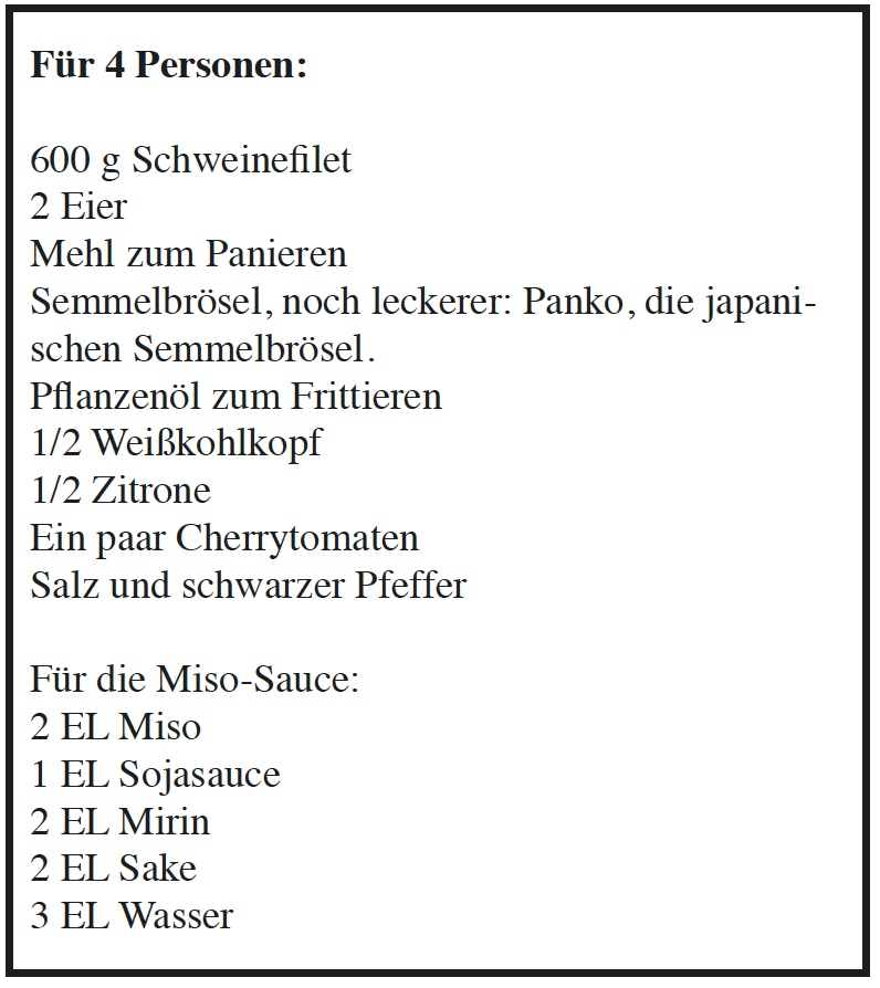 In Japan ist es wie bei den Nudeln auch bei den panierten Fleischgerichten. Tonkatsu-Restaurants (Katsu ist nichts anders als Kotelett auf japanisch) servieren nur diese in allen Variationen. Das Gericht hier zählt zu den Klassikern in der japanischen Küche und nennt sich Hirekatsu (Hireka = Filet).