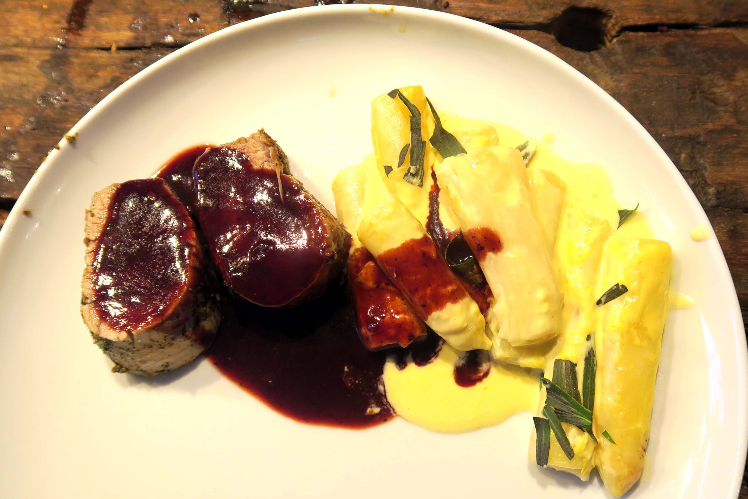 Im Prinzip geht es darum, die Lende nicht pur zu servieren. Dazu eignet sich am besten eine Soße, die man parallel zum Schmoren der Lende zubereiten kann.