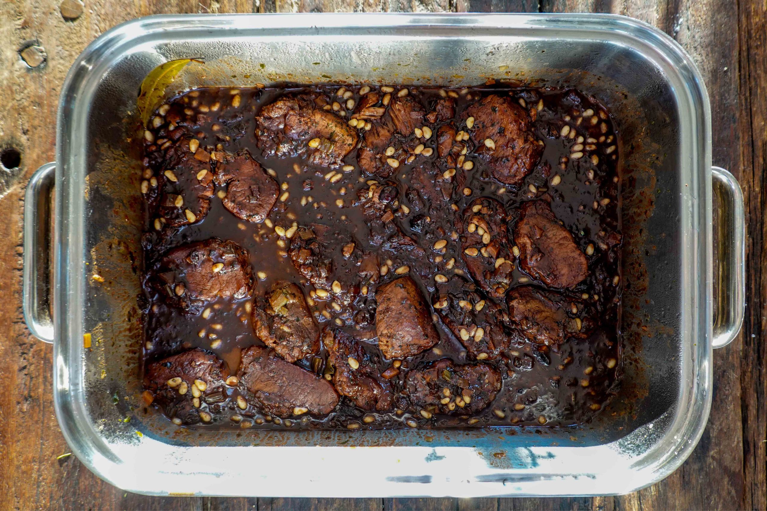 Wenn das Fleisch so weit ist, die Mischung hinzugeben und solange umrühren, bis die Schokolade geschmolzen ist. Mit dem Essig vorsichtig abschmecken und noch ein paar Minuten sanft köcheln lassen.