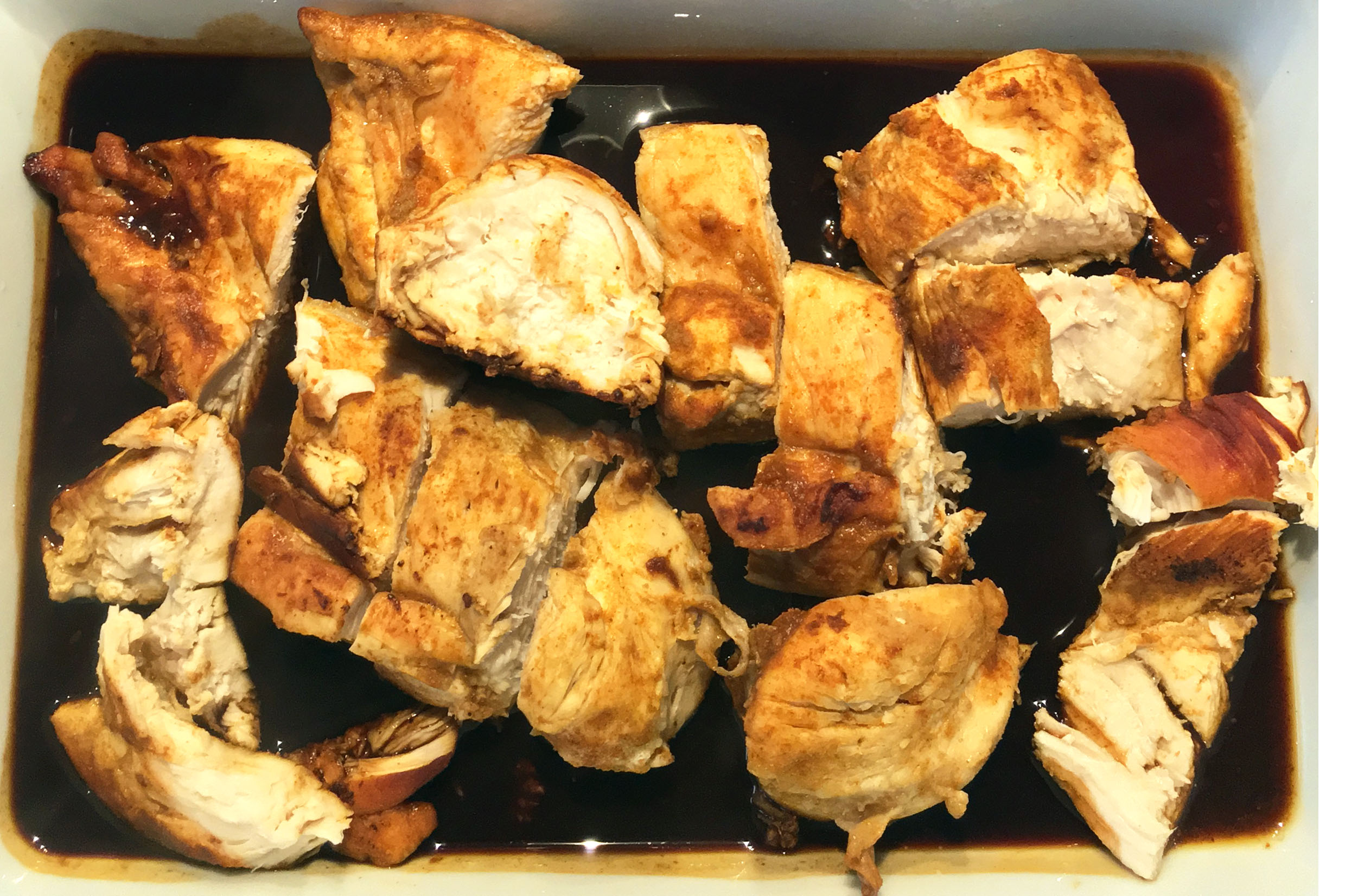Schließlich den Saft des Hühnchens aus dem Backofen unterrühren. Mit Salz und Pfeffer abschmecken.