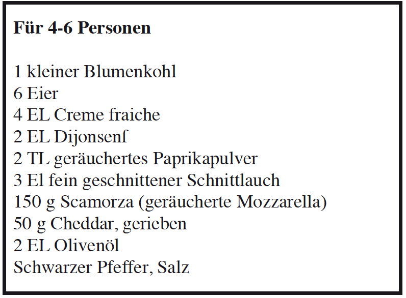 Den Blumenkohl in Röschen schneiden, den Scamorza mit der Rinde reiben und mit dem Cheddar mischen. In einer Schüssel die Creme fraiche, den Senf und das Paprikapulver mit den Eiern verquirlen.
