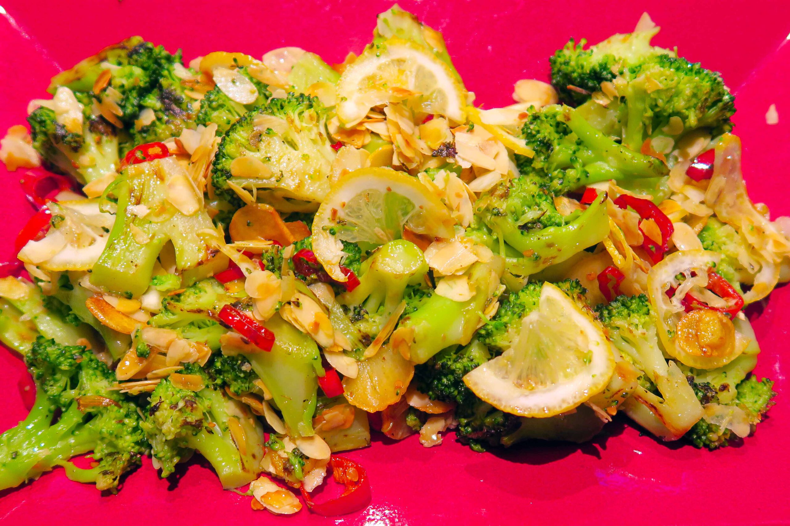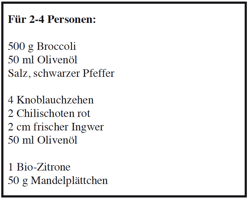 Das Öl mit dem Knoblauch, Chili und Ingwer über den Broccoli geben und vermischen. Auf einer Platte anrichten und dann die gerösteten Mandeln und die Zitronenscheiben darüber ver-teilen. Schmeckt auch am nächsten Tag kalt noch lecker.