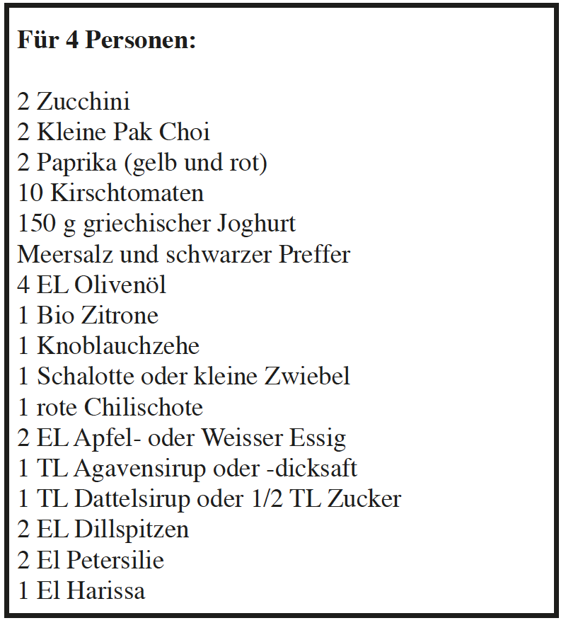 Das Rezept ähnelt ein bisschen den Kirschtomaten auf Joghurt, 4.12 ist aber vielfältiger. Denn man kann auf dem Backblech nicht nur Zucchini und Paprika, sondern auch viele andere Gemüse unterbringen. Was auch immer der Kühlschrank hergibt. Wir haben sehr gute Erfahrungen mit der Kombination aus Paprika, Zucchini, Pak Choi und Tomätchen gemacht. Man kann aber auch einfach nur zwei Gemüsesorten wählen.