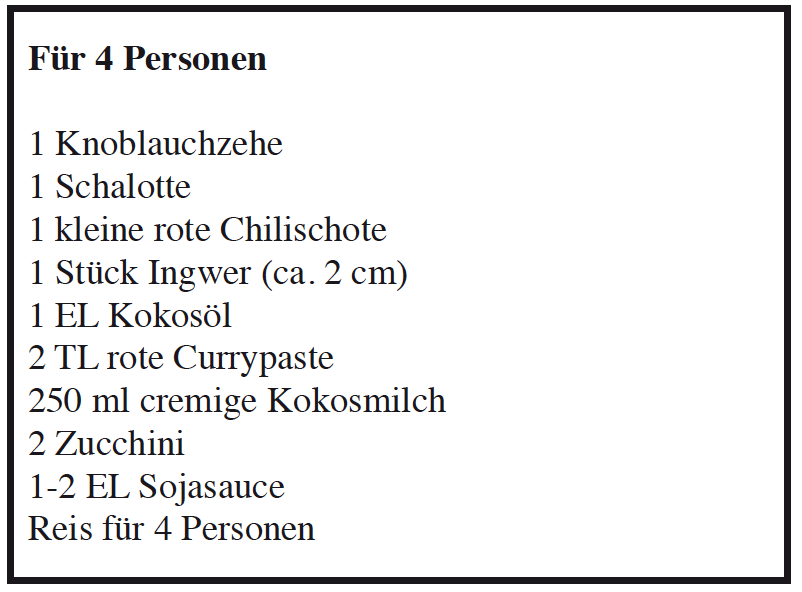 Kleiner Aufwand, großer Geschmack. Wir haben dieses Curryrezept schon mehrfach in Variationen gekocht. Weil zum Beispiel nur noch eine Zucchini im Kühlschrank war, haben wir die Auberginen und die Karotten, die dort auch noch rumlagen und zu keinem ganzen Gericht mehr gereicht haben, einfach mit verarbeitet. Dann war das eben ein Zucchini-Auberginen-Karotten Curry. Auch sehr lecker!