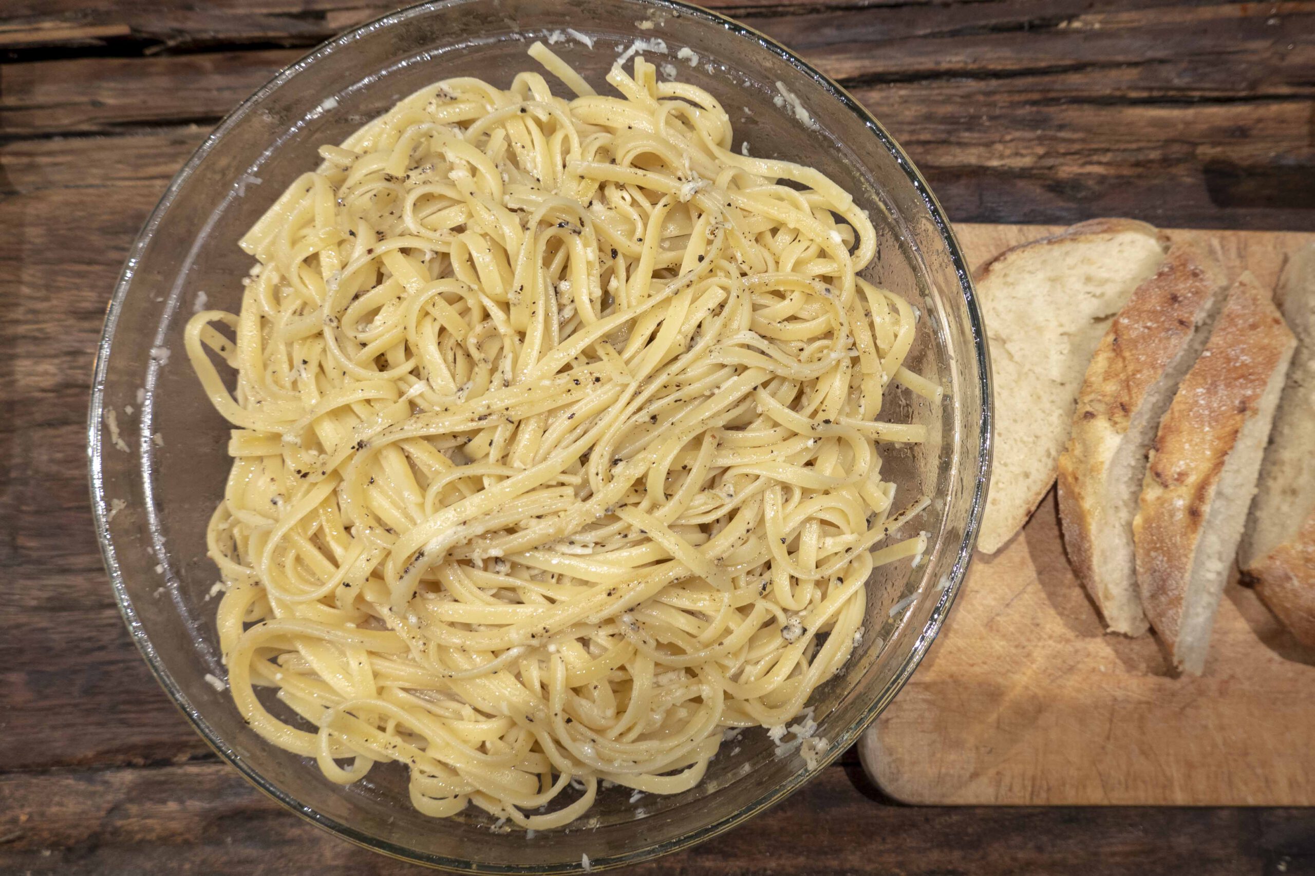 Am besten in einer vorgewärmten Schüssel die Nudeln mit dem Olivenöl, der Butter und dem Pecorino vermischen. Reichlich Pfeffer darüber geben, vermengen und sofort servieren. Wenn nötig noch etwas nachsalzen.