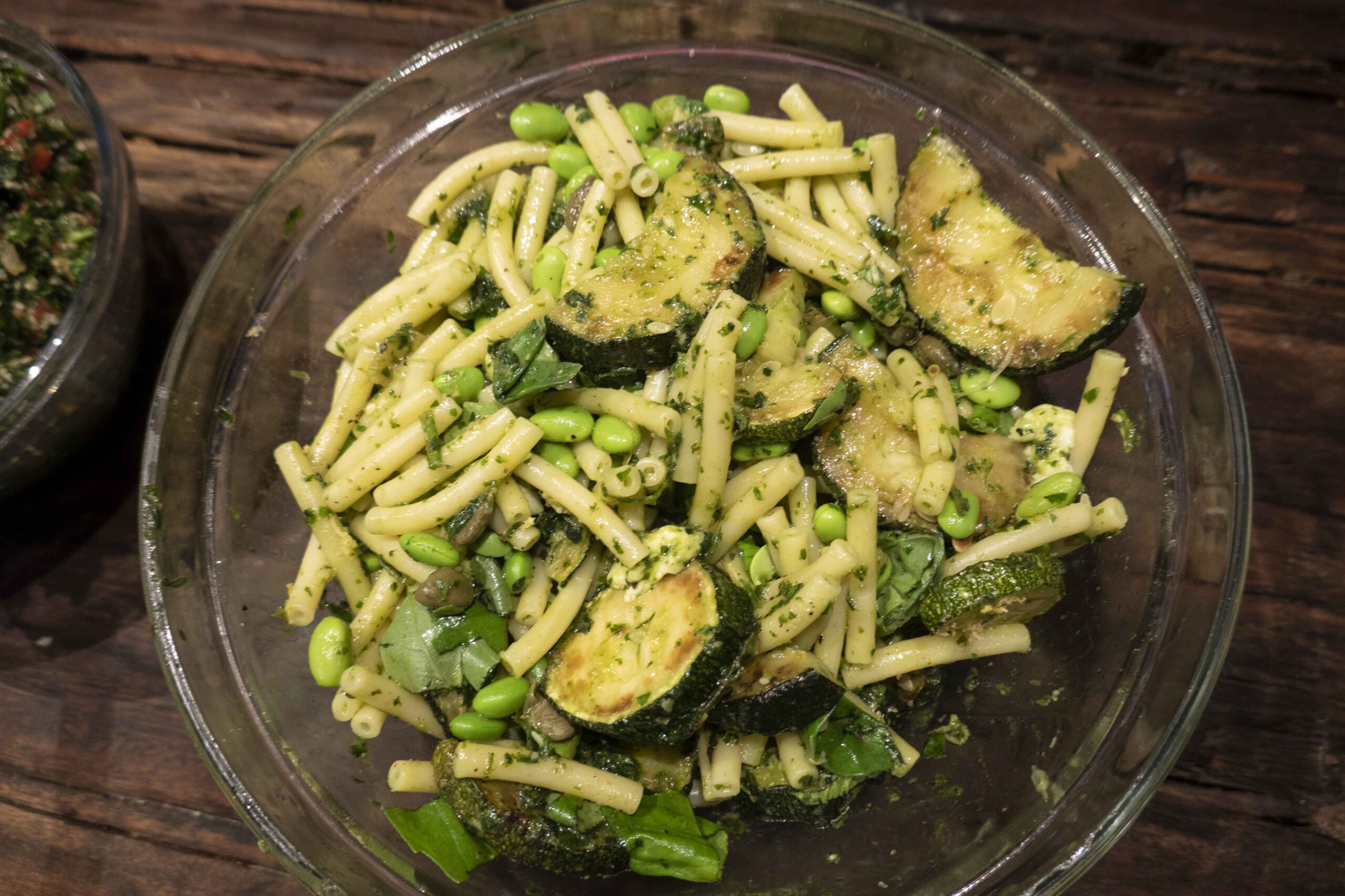 In den Nudeltopf die Zucchini mit der Marinade, das Pesto, die Zitronenschale, die Edamame, die Kapern und den Mozzarella geben. Vorsichtig vermischen und vor dem Servieren noch das übrige Basilikum unterheben. Eventuell in eine Schüssel oder Schale geben oder im Topf auf den Tisch stellen.