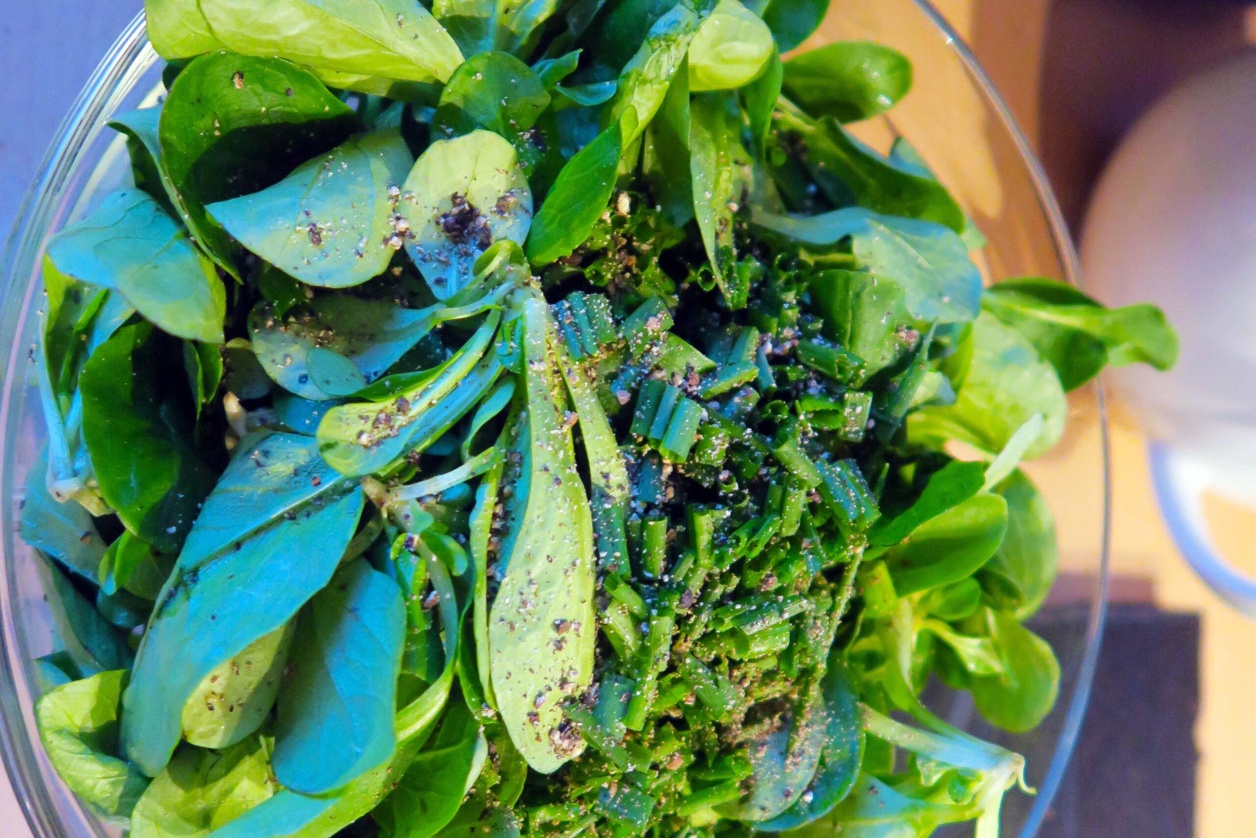 Achtung: Feldsalat wird ganz schnell welk, also erst unmittelbar vor dem Servieren anrichten.