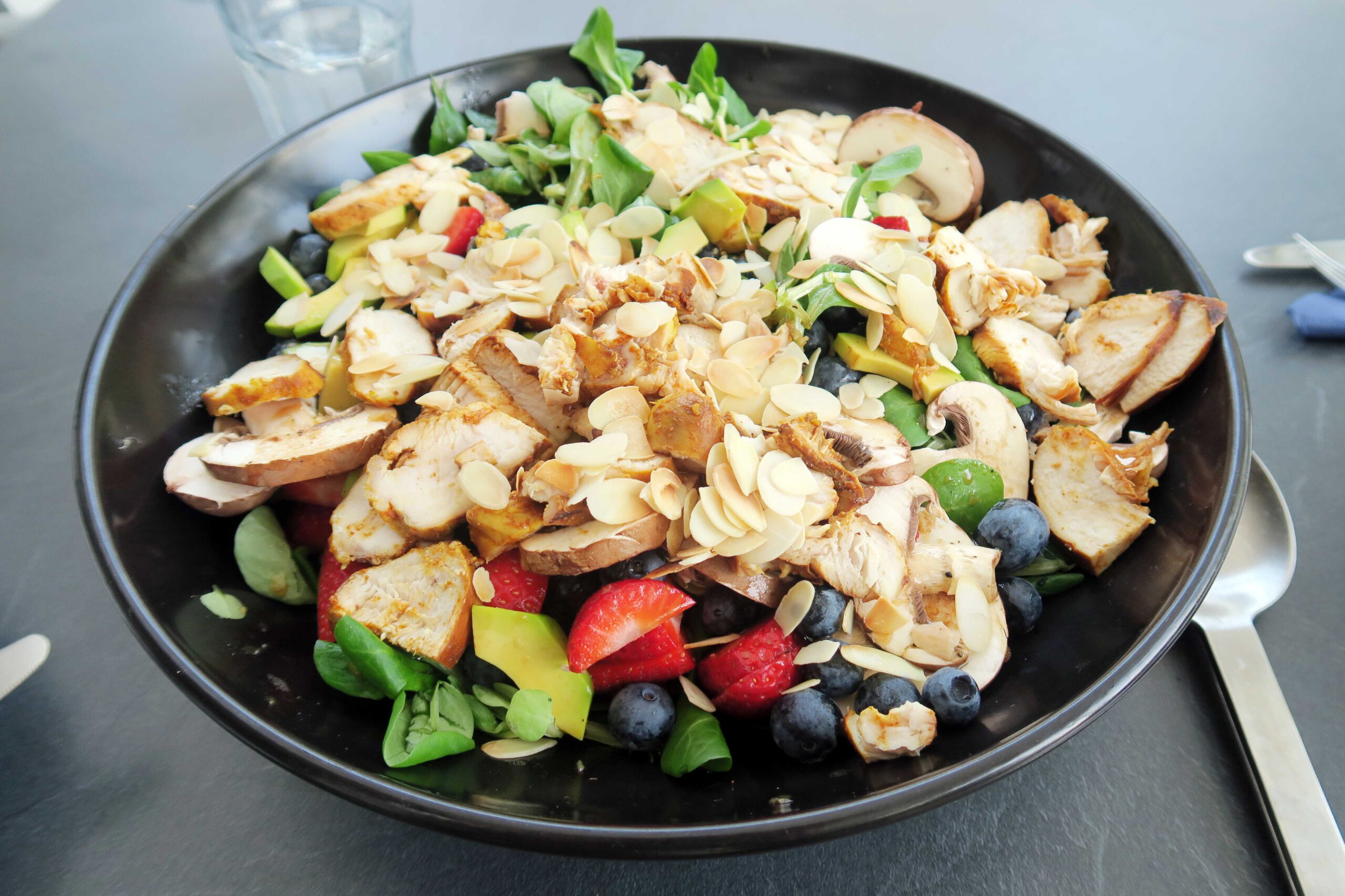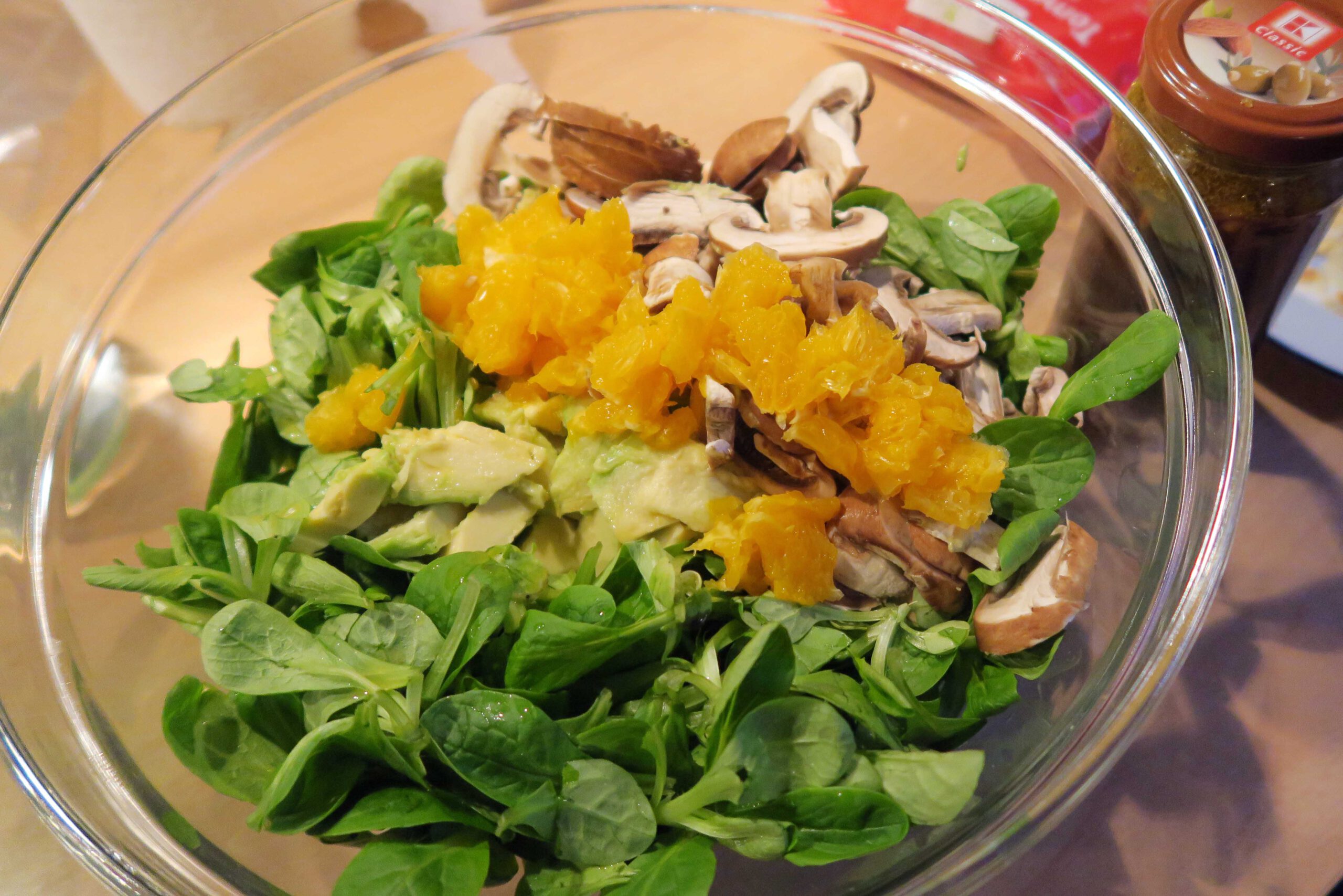 - Feldsalat mit Hühnchen, Pilzen und Früchten und Mandel – Orangen Vinaigrette: