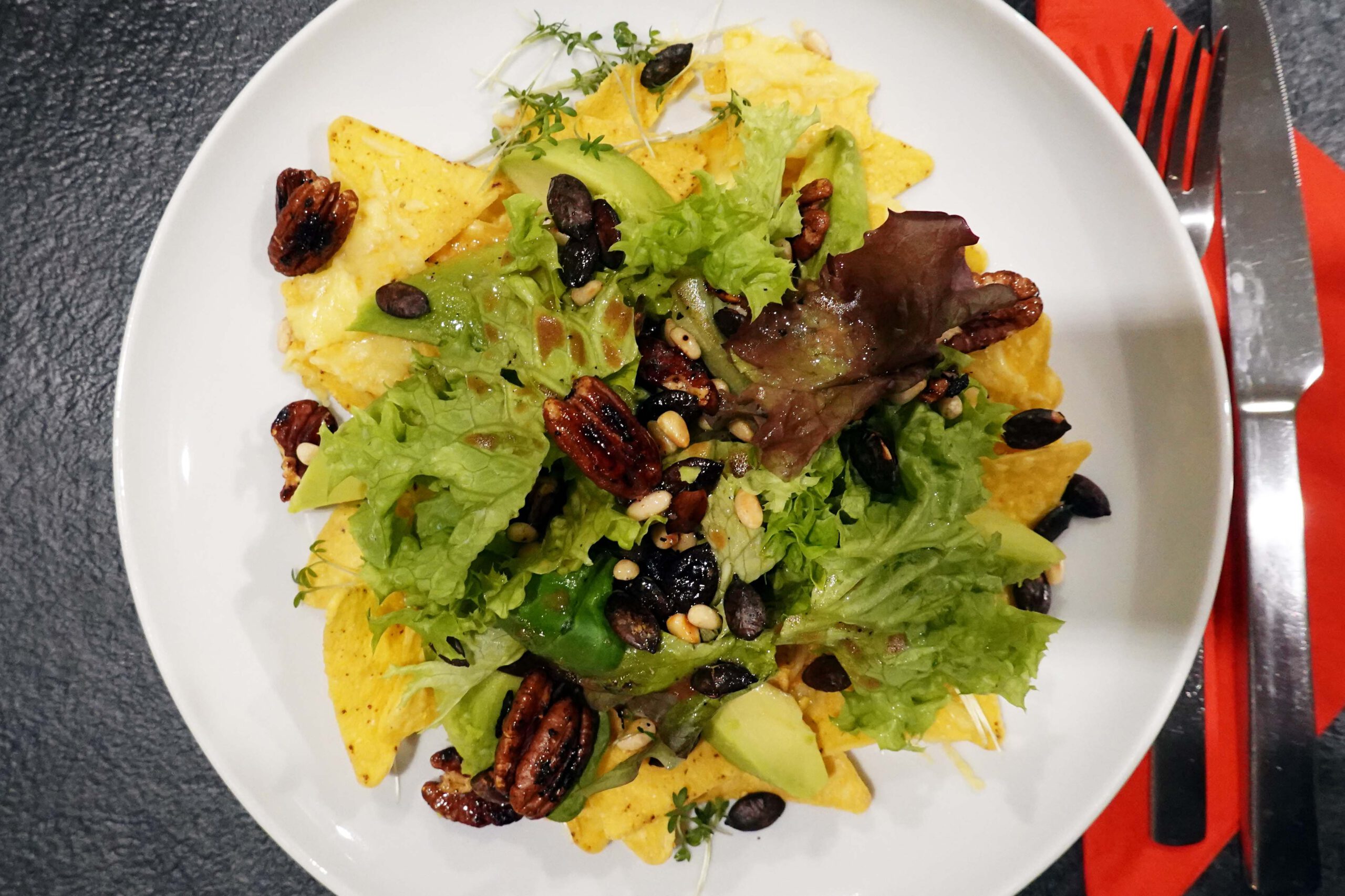 Auf den Tellern zuerst die Tortilla-chips mit dem Käse verteilen, darauf die Avocados anorndnen, dann die Salate darüber türmen, Kerne und Nüsse darüber streuen und schließlich die Soße mit dem Rest des Zitronensaftes drauf gießen.