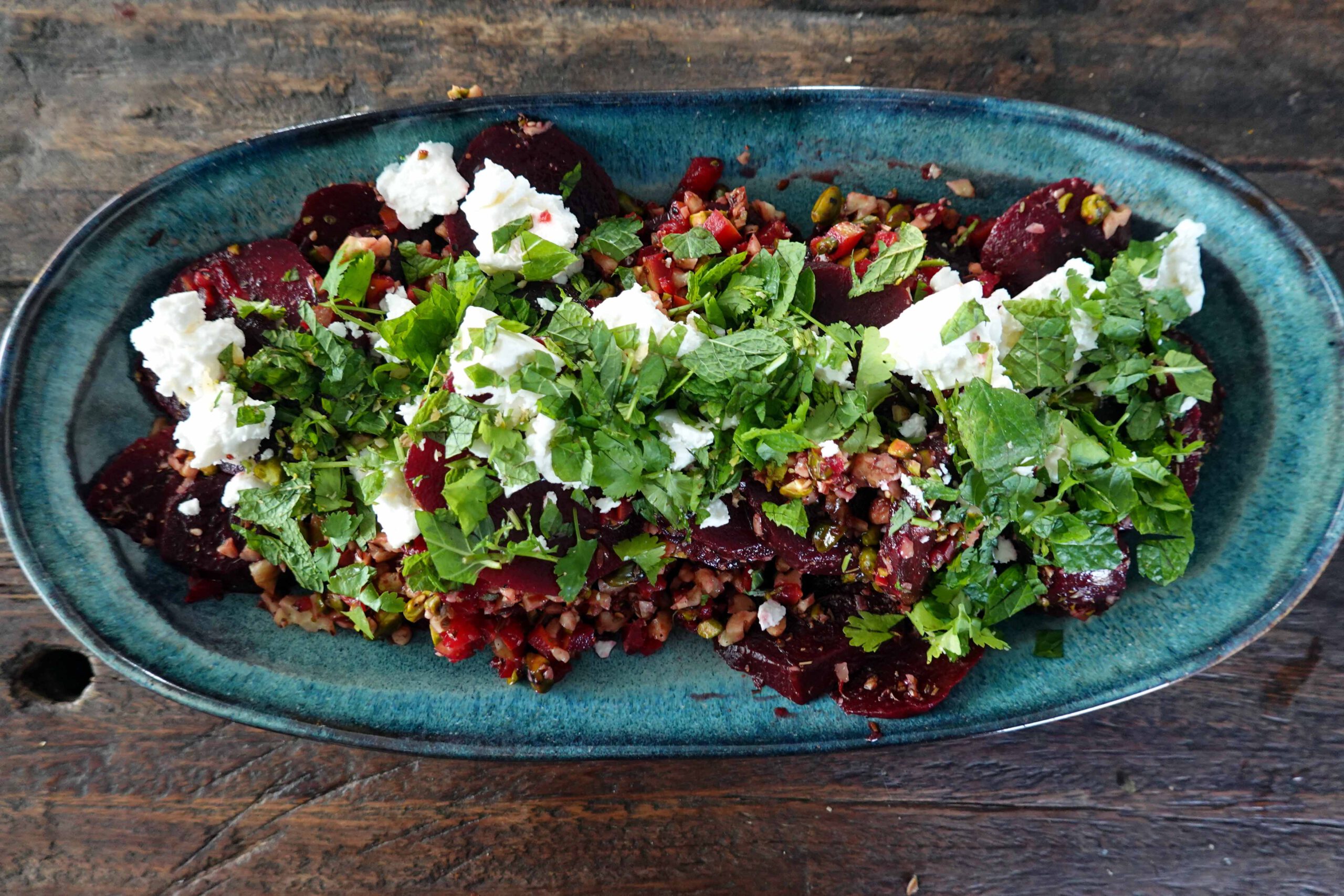 Das Gemüse in der Schüssel noch einmal abschmecken, dann mit dem Saft aus der Schüssel auf einer entsprechenden Platte oder Schale verteilen. Den Schafskäse zerbröseln und mit dem Koriandergrün, der Minze, dem Zatar und den Nüssen darüber verteilen und servieren.