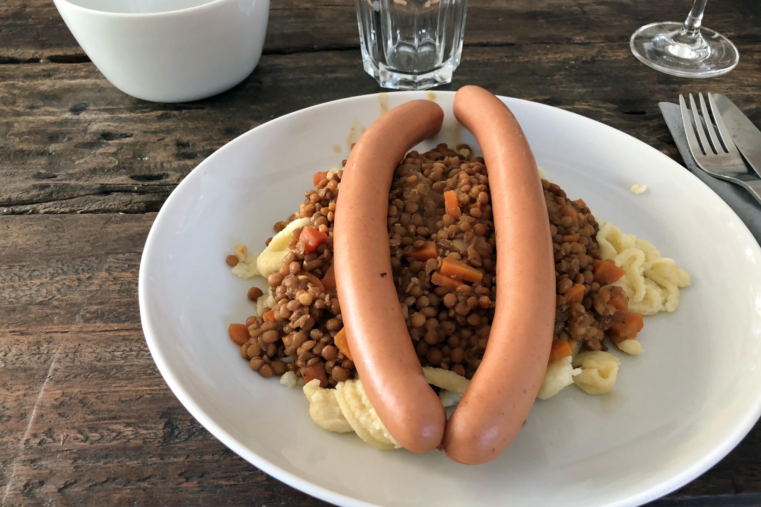 Die Spätzle in einer Schüssel und die Linsen mit den Würstchen in einer anderen Schüssel servieren. Etwas Essig und für die Würstchen Senf anbieten.